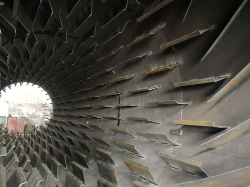 要想將干粉砂漿烘干到合理的水分,烘干機的安裝工藝和設(shè)計工藝非常重要,由于粉狀物料流動性不如固體物料,干粉砂漿烘干機的安裝需要設(shè)計一個合理的傾斜角度,能讓物料在被烘干的過程中勻速流動,這個流速需要達到剛好物料到出口處時被烘干,所以傾斜角度的設(shè)計很重要。然后是設(shè)計工藝,粉狀物料會由于重力的作用沉積,要想充分將其烘干,必須進行打散揚起,讓高溫氣流從物料種穿過,這就對筒體內(nèi)的設(shè)計工藝提出要求,除了安裝揚料板,還要對排布位置,間距、密度等參數(shù)有一個合理的設(shè)計。